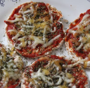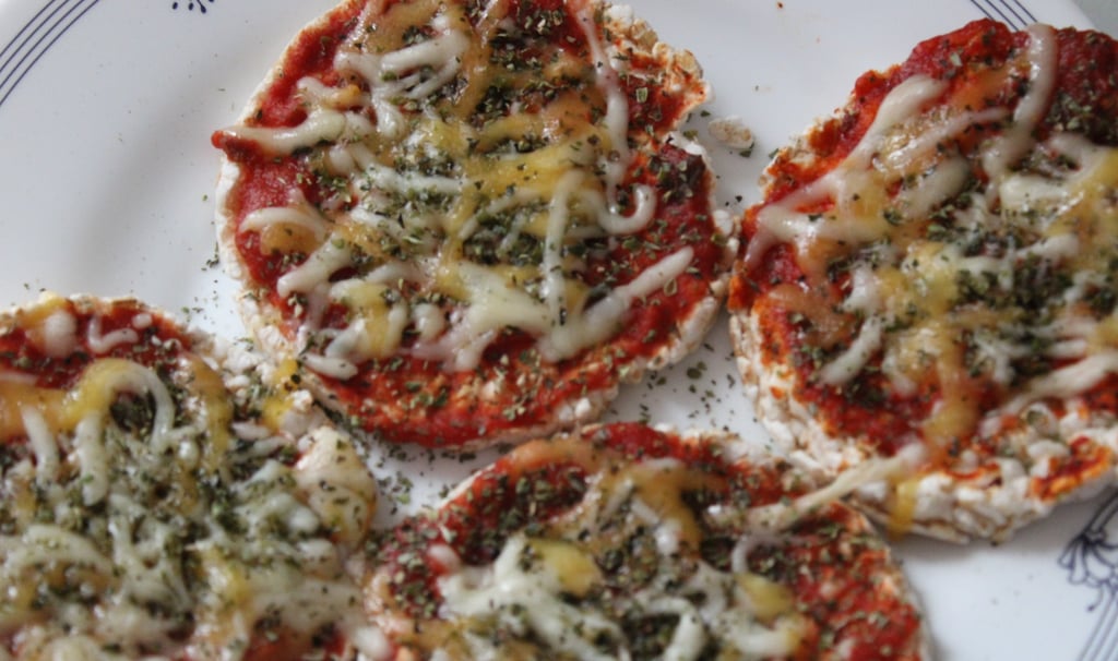 Extiende la salsa de pizza sobre las tortas de arroz.